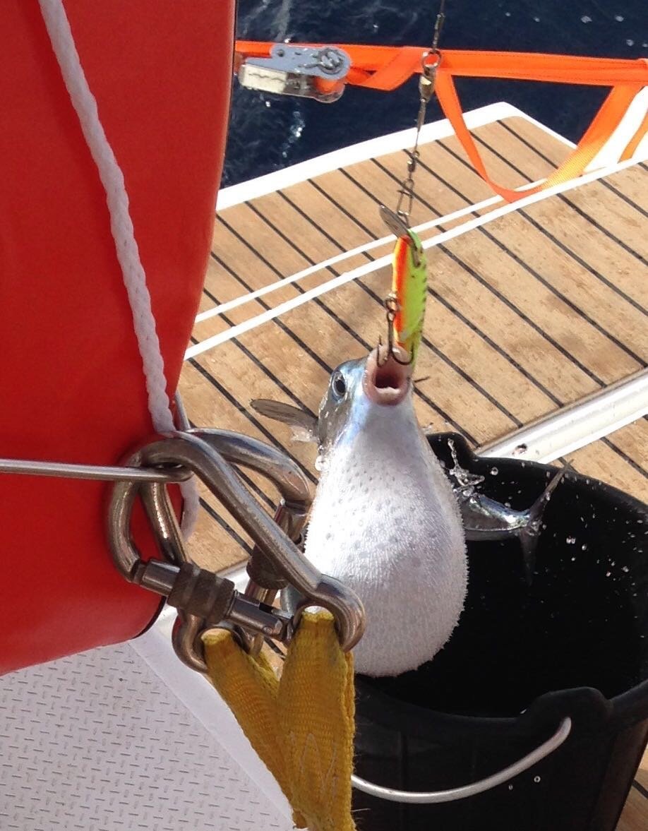Sigi reduziert die Geschwindigkeit und da kommt schon was in Sicht. Sieht aber nicht aus wie ein Fisch! Ich denke zuerst, dass wir nur eine Plastiktüte einholen, aber dann erkenne ich ein Tier. Mein zweiter Gedanke ist ein ziemlich mitleidiger: der Haken hat bei dem Fisch was zerrissen und der ganze Bauchraum ist voller Wasser gelaufen. Dann aber zischt JD nervös, während ich die Schnur mit dem Fisch über den Eimer ziehe: „Das ist ein Kugelfisch, sei bloß vorsichtig!“ Zu meiner Schande muss ich gestehen, dass die Biologin dies erst mal als Dummschnack abgetan hat – Asche auf mein überhebliches Haupt!