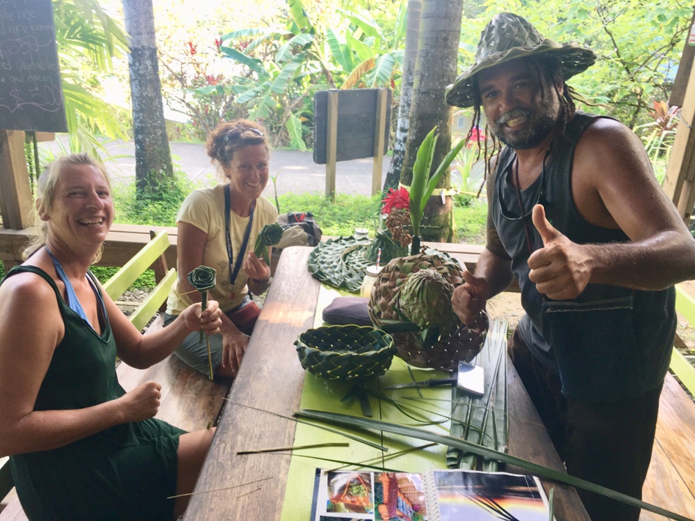 Und dann erfuhren wir, dass er am Nachmittag einen Workshop in Selina’s Hostel neben an in der Marina geben wird. Also nichts wie hin und schon nach einer Stunde könnte ich die Rose selbst binden. Nächste Woche geht es weiter. Dann lernen wir hoffentlich solche Schalen zu machen. Für uns ist das hier besser als Stricken! Eine tolle und umweltverträgliche Beschäftigung, mit der sich dann auch noch etwas Geld verdienen ließe.