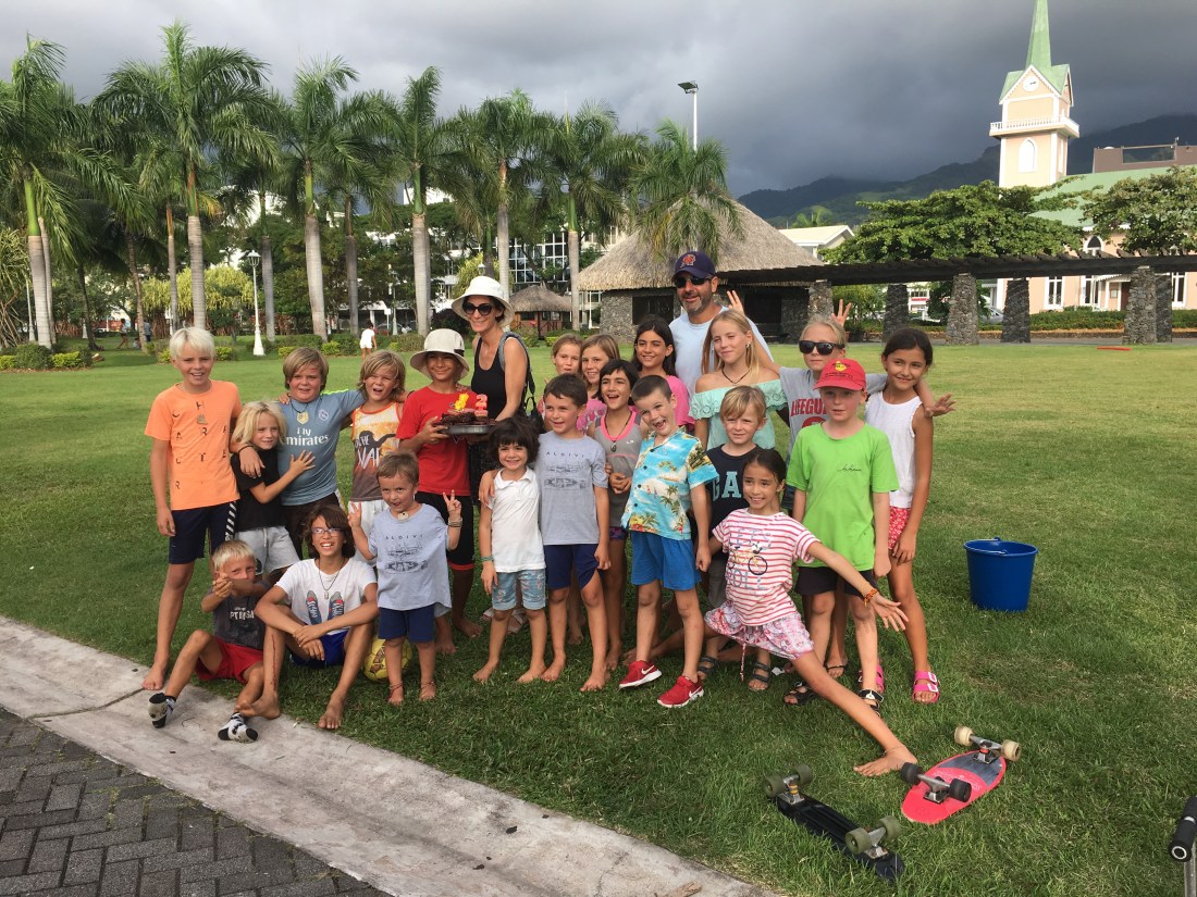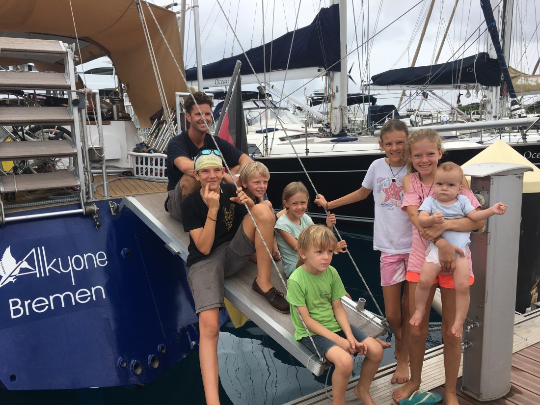 Es war auch genau der richtige Zeitpunkt, hier einzulaufen. Der Mara’amu, der hiesige Starkwind, hatte gerade begonnen und alles was Rümpfe hat, war wenn möglich, an sichere Liegeplätze gehuscht. Der Hafen platze aus allen Nähten! Kurz nach uns kamen ALKYONE und SAGO an. So konnte Michels fünfter Geburtstag standesgemäß mit acht deutschsprachigen Kindern gefeiert werden.