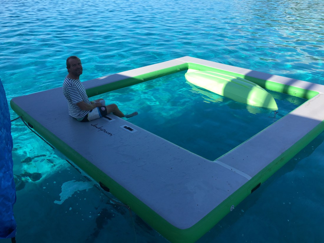 Ich freue mich schon darauf, mit anderen Kinderschiffen auf so einem traumhaften Ankerplatz wie vor Vaiare (Moorea), zu liegen. Dort haben wir zum ersten Mal unseren Sea-Pool aus den Abgründen unseres Ankerkastens gewuchtet, und aufgeblasen. Ein tolles Spielzeug! Gedacht war er für die Kinder, als Schutz vor Quallen oder starker Strömung. Das hierfür vorgesehene, einhängbare Netz haben wir allerdings nicht mit ausgepackt, denn keins von beidem ist uns innerhalb der Atolle begegnet. Viel mehr ist es aber eine ganz tolle Badespaß-Plattform! Rennen darauf, abrutschen und platsch. So geht es dann stundenlang. Und JD liebt es, seinen Morgenkaffee auf der breiten Fläche sitzend mit den Beinen im Wasser zu genießen; und dabei die vielen dutzend verschiedenen Rifffische zu beobachten. Es gibt hier viele Nemos (Clownfische) und verschiedenste Arten Dorys (Doktorfische). Wunderbar, wenn der Sea-Pool dann über so einen Korallenfleck quasi schwebt.