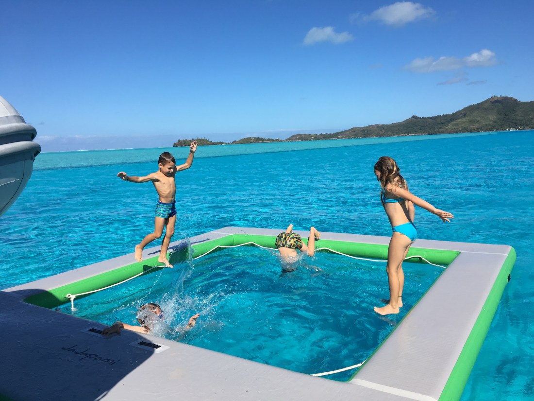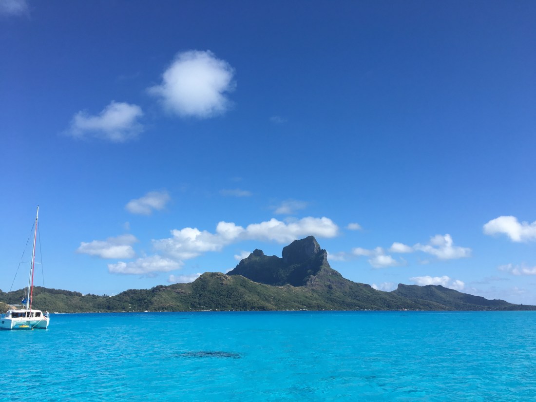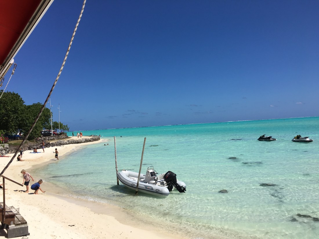 Wir liegen vor Bora Bora, inmitten der vermutlich schönsten Farbenpracht, die unsere Erde zu bieten hat. Das Meer unter uns schimmert in klarstem türkisblau, über fast weißem Korallensand. Teile des Aussenriffs sind bewaldetes und palmengesäumt, mit breitem, sauberen Sandstrand. Nur ein paar Meter weiter, verläuft eine schnurgerade Grenze durchs Wasser, hinter der die Farbe abrupt zu einem sehr hellen grünblau wechselt. In diesem, nur 1,20 Meter tiefen Bereich, kann man bemerkenswert viele Adler- und Stachelrochen über den Grund fliegen sehen.