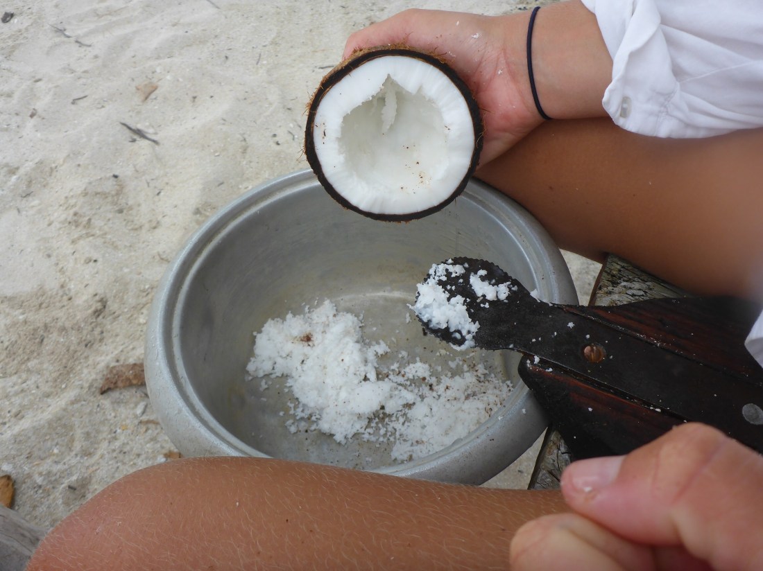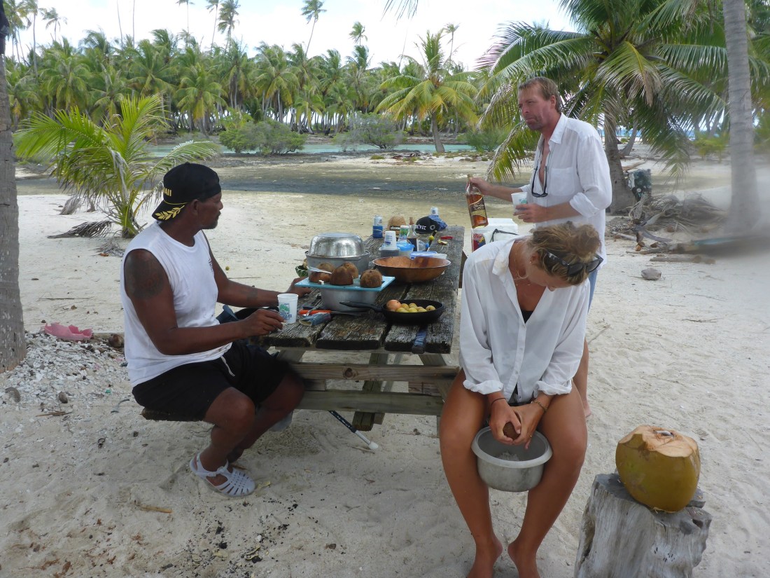 Die Fische kommen auf einen selbstgebastelten Riesenrost, über ein heruntergebranntes Feuer am Strand. Gleichzeitig werden die großen, grünen Brotfrüchte in die Asche gelegt. In einer unglaublich kurze Zeit wird Kokosmilch hergestellt: die braunen, halb verrottet aussehenden Nüsse werden auf einen Metallpin aufgespießt und die faserige Hülle abgerissen und -gehebelt. Die eigentliche Nuss wird nun mit der Machete halbiert und mit einem interessanten Metall-draufsitz-Raspeler, zu Brei geschabt. Den Brei fluchs in einem Tuch ausdrücken, und voila, frische Kokosmilch für Poissont Crue ist fertig! Rohen Papageifisch in Limone garen, Tomate, Gurke, Zwiebel und Kokosmilch dazu: fertig ist das Nationalgericht von Polynesien!