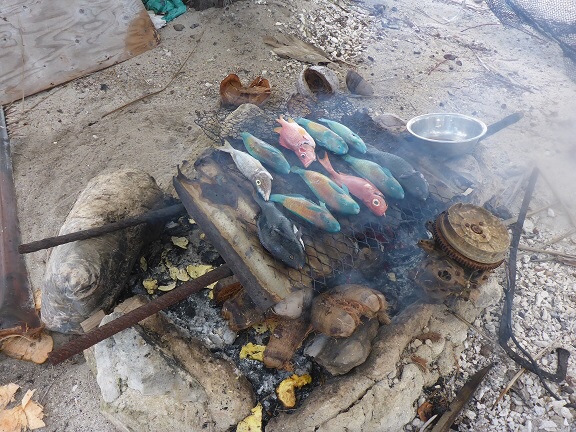 Gleich an einem der ersten Abende, wurden wir zum polynesischen Barbecue eingeladen! Großartig! Während wir friedlich am Anker schaukelten, mit Frühstück und Schule beschäftigt, sind die beiden zum Aussenriff getuckert und haben, mal eben, ein Duzend kleine Rifffische gefangen.