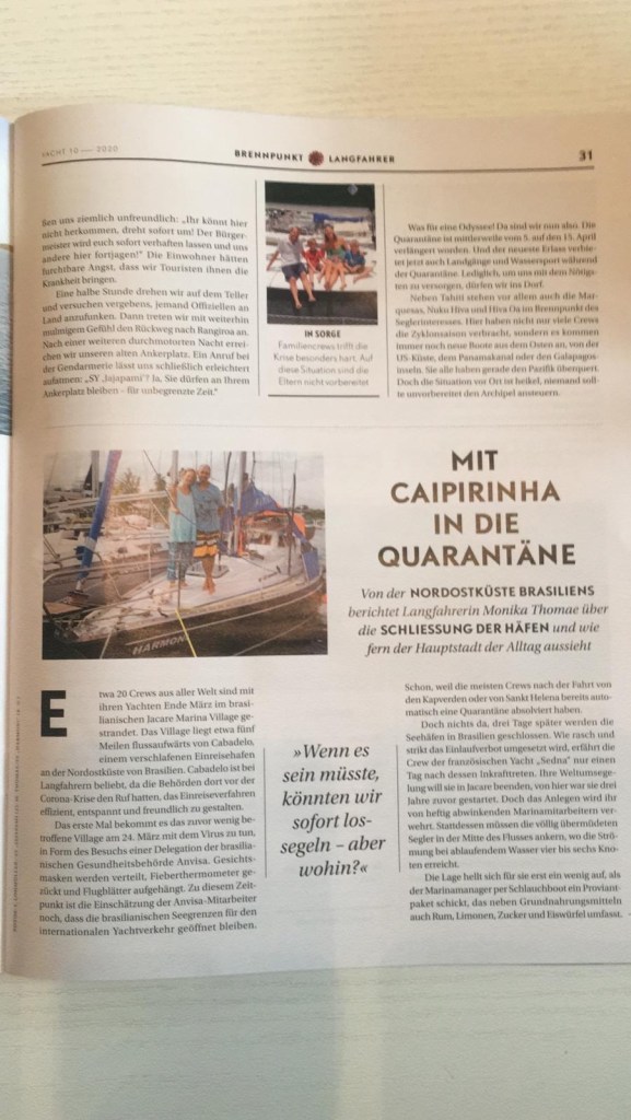 „Als vor einer Woche das Confinement begonnen hat, haben wir hier ein VHF net gestartet. Eine Kanadische Familie hat sich bereit erklärt, als Sprecher zwischen uns und den Behörden zu fungieren. Wir hatten einige Probleme hier, z.B. wohin mit dem Müll, da es hier keine Mülltonnen gibt. Sie übersetzen uns auch jeden Morgen die lokalen Nachrichten aus dem Französischen, das hilft. Die lokalen Behörden sind sehr nett hier. Wir haben noch nichts Negatives erlebt. Die Regeln sind in ganz FP dieselben. Wir sind seit dem Confinement noch nicht an Land gegangen, wollen uns vor dem Virus schützen. Wir sind hier alle guter Dinge und sehr froh, unter diesen Umständen auf einem Boot leben zu dürfen. Wir können schwimmen, sind ans Homeschooling gewöhnt und insofern ist es für uns wie eine lange, sehr komfortable Ozeanüberquerung mit Internet und ohne Wellen.