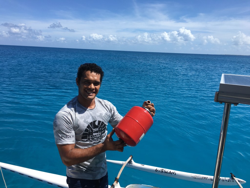 Manua kam Mittags in seinem Außleger-Kanu. Viele Tahitiens sind sehr kräftig gebaut und diejenigen, die den Nationalsport Pirogue (Kanu) fahren, ernst nehmen, haben eine bemerkenswerte Muskulatur! So hatte es unser Helfer nicht gerade leicht, sich in Arbeitsposition zu manövrieren, aber er hat nicht nur Das geschafft, sondern auch, mit viel Kraft, die Rohrverbindung aufgeschraubt bekommen. Dann hat er das Ding mitgenommen, mal eben von seinem Kumpel schweißen lassen, und wieder zurückgebracht. So konnten wir uns am Nachmittag schon wieder das Meerwasser abduschen. Was das für ein Luxus ist, merkt man erst wieder, wenn es mal nicht möglich ist!