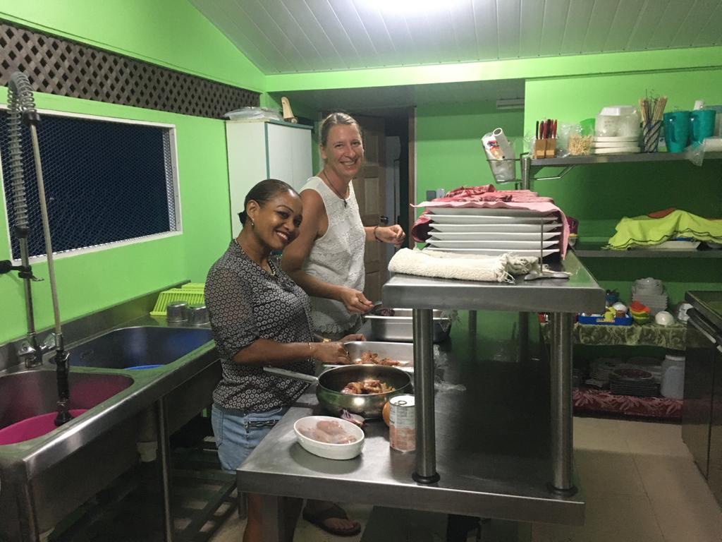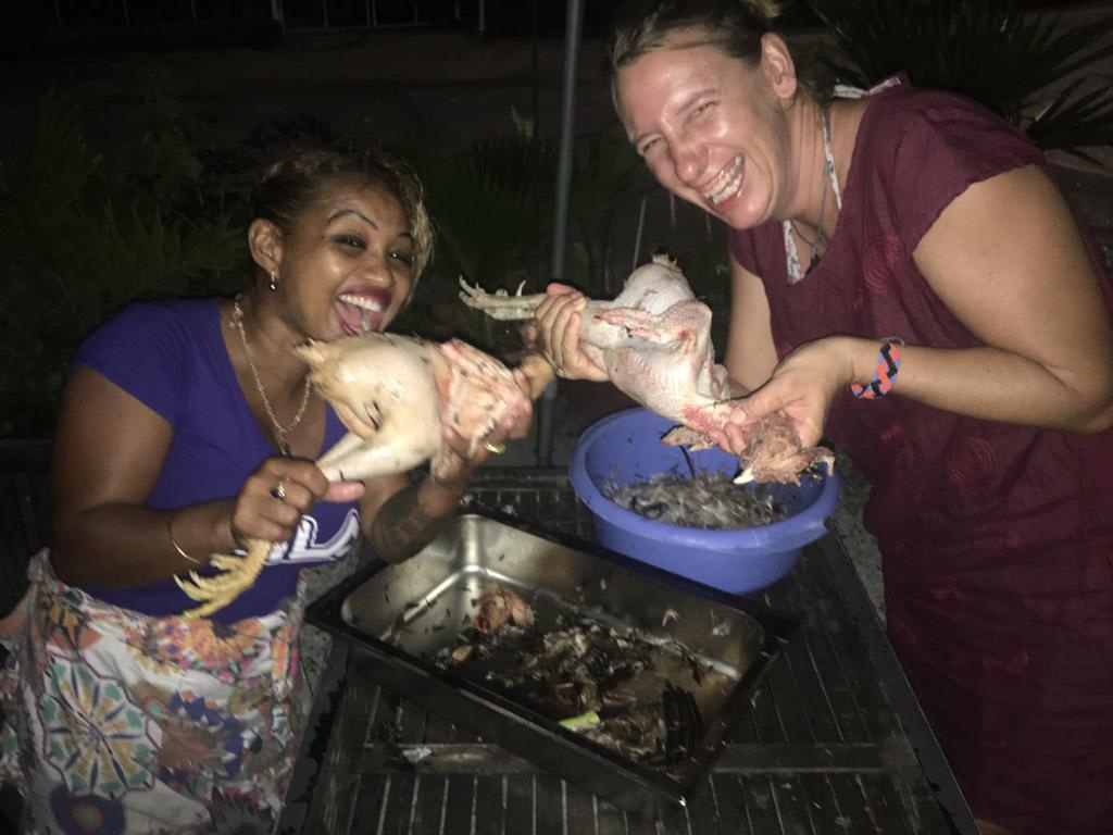 Lili (unsere Freundin vom „Snack Lili“) war natürlich total verständnisvoll und wir haben schon vor Wochen überlegt, eines der freien, verwilderten Hühner zu fangen. Aber diese Streuner sind wie die Hunde: mager und verlaust und damit nicht besonders appetitlich. So gab es erst mal weiterhin hauptsächlich Fisch, Steak-Frites und Hamburger (Lilis Mahi-Mahi in Vanilla-Sauce ist übrigens sagenhaft lecker!!).