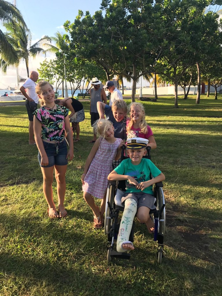 Auch Michel ist, trotz Gipsbein, nicht zu kurz gekommen. Zu seinem Geburtstag haben wir eine große Schokotorte bestellt und neben dem deutschen Peter und zwei weiteren Crews, haben die Mädels der CHASING WATERFALLS die Kinderfahne hochgehalten. Topfschlagen und Dosenwerfen im Park, war auch vom Rollstuhl aus möglich!