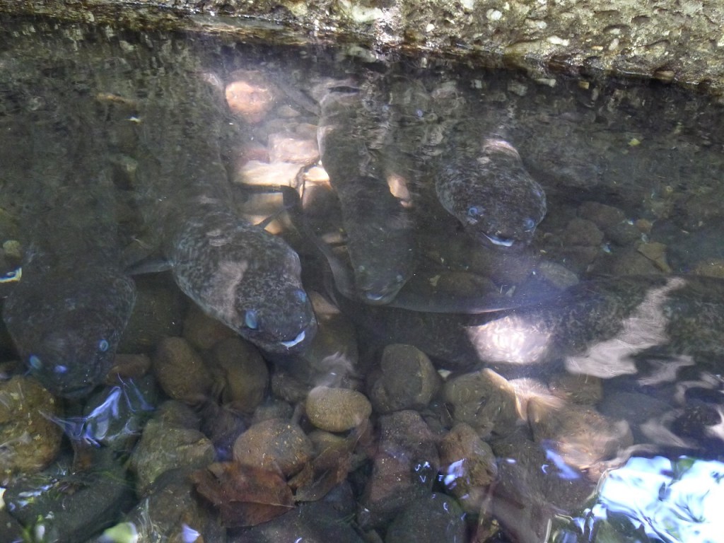 Wir hatten also eine gute Zeit in Fare. Mal Strand, mal Kayak, mal gesellige Happy Hour während die Jungs Krabben fangen, und einmal auch wieder einen Mietwagen um ein bisschen rumzufahren. Wahnsinnig viel gibt es hier nicht zu erkunden, aber der Tag hatte ein paar schöne Highlights. Wir sehen den Dschungel der Inseln ja meist nur von der Küste aus, da ist es immer toll, mal wieder mitten drin zu sein. Ein Flüsschen ist bekannt für seine blauäugigen Aale und Michel und ich fanden es super spannend, hineinzuklettern und die friedlichen Riesen vorsichtig zu streicheln. Sie sind unglaublich weich, so dass man die Berührung kaum spüren kann!