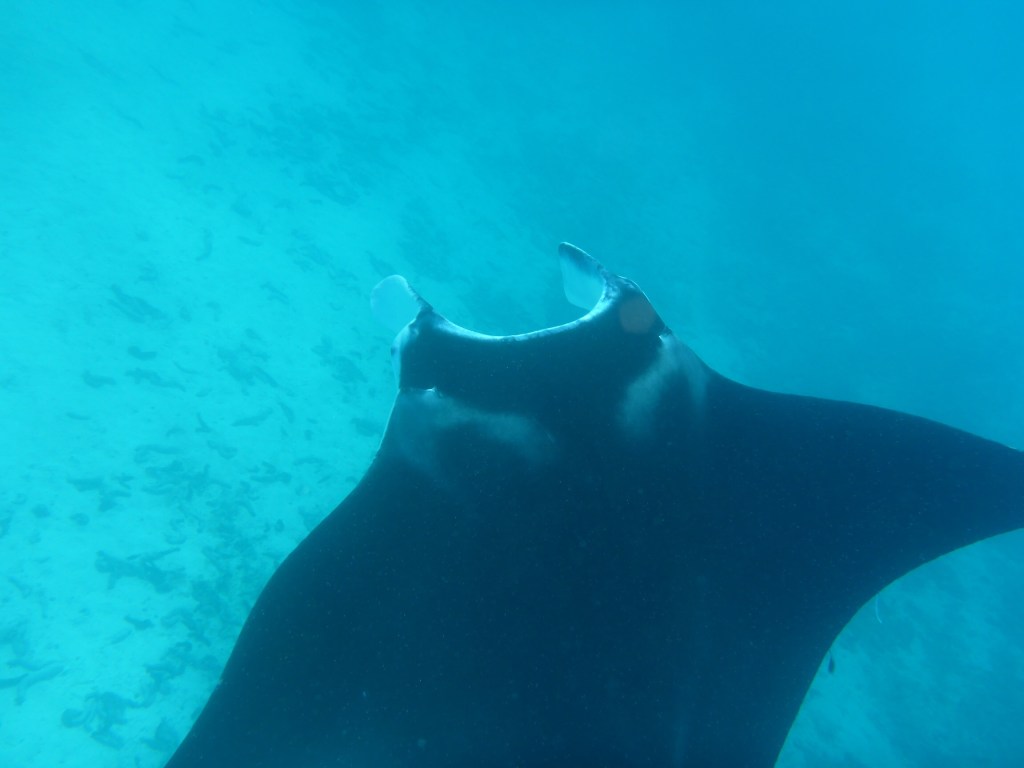 Bei einem Dinghiausflug mit den anderen Crews, finden wir ein Rudel Mantarochen. Hier leben zwar recht viele, aber es ist immer Glückssache, sie zu finden wenn man es darauf anlegt und Schnorchelsachen dabei hat! Während Carlos und Sanne, die ausnahmsweise die große Kamera mithat, sie vorsichtig im Boot verfolgen, springen Julie, Trols, Klein-Sally, Michel und ich ins Wasser. Das größte Tier hat ca. 2,5 m Spannweite und es ist unglaublich beeindruckend, wie es majestätisch unter uns hindurch fliegt. Immer wieder sehen wir sie ihre großen, langsamen Loopings drehen. Die beiden Großen im Dinghi behalten den Überblick und lotsen uns Schwimmer in die richtige Richtung, wenn wir die Riesen aus den Augen verlieren. Die beiden Kleinen sind begeistert und Michel würde soo gerne mal einen von ihnen streicheln, aber näher als zwei Meter kommen wir nie heran. Sie scheinen uns zwar überhaupt nicht zu bemerken, aber ich glaube nicht, dass dieser Abstand Zufall ist. Wir haben kleinere Adlerrochen gesehen, die, genervt von unserem Dinghi, ganz plötzlich in einem irren Tempo davon geflitzt sind. Mantas können, laut Wikipedia, 12 km/h erreichen, was sollen sie sich da von einem Menschlein stören lassen.