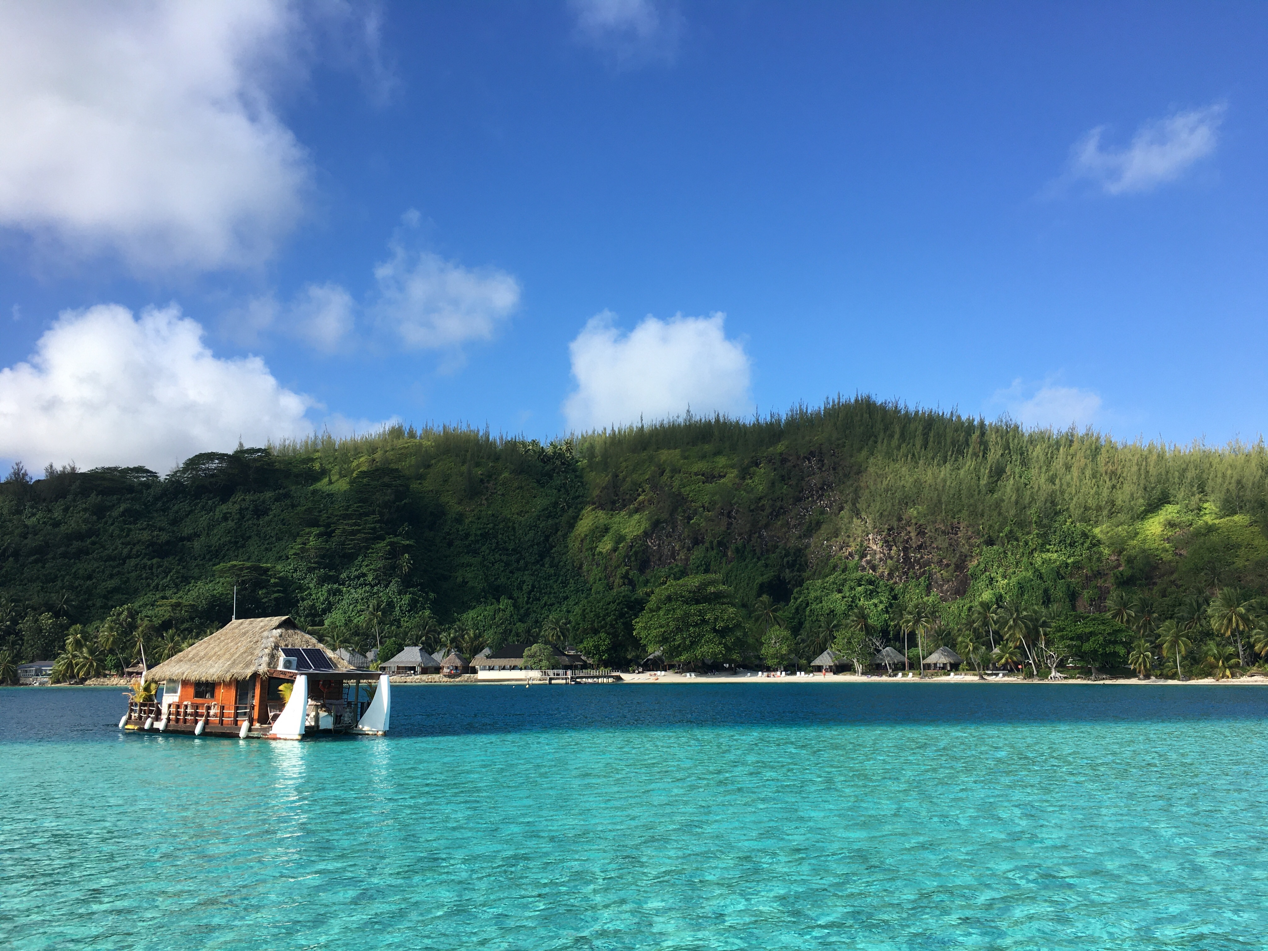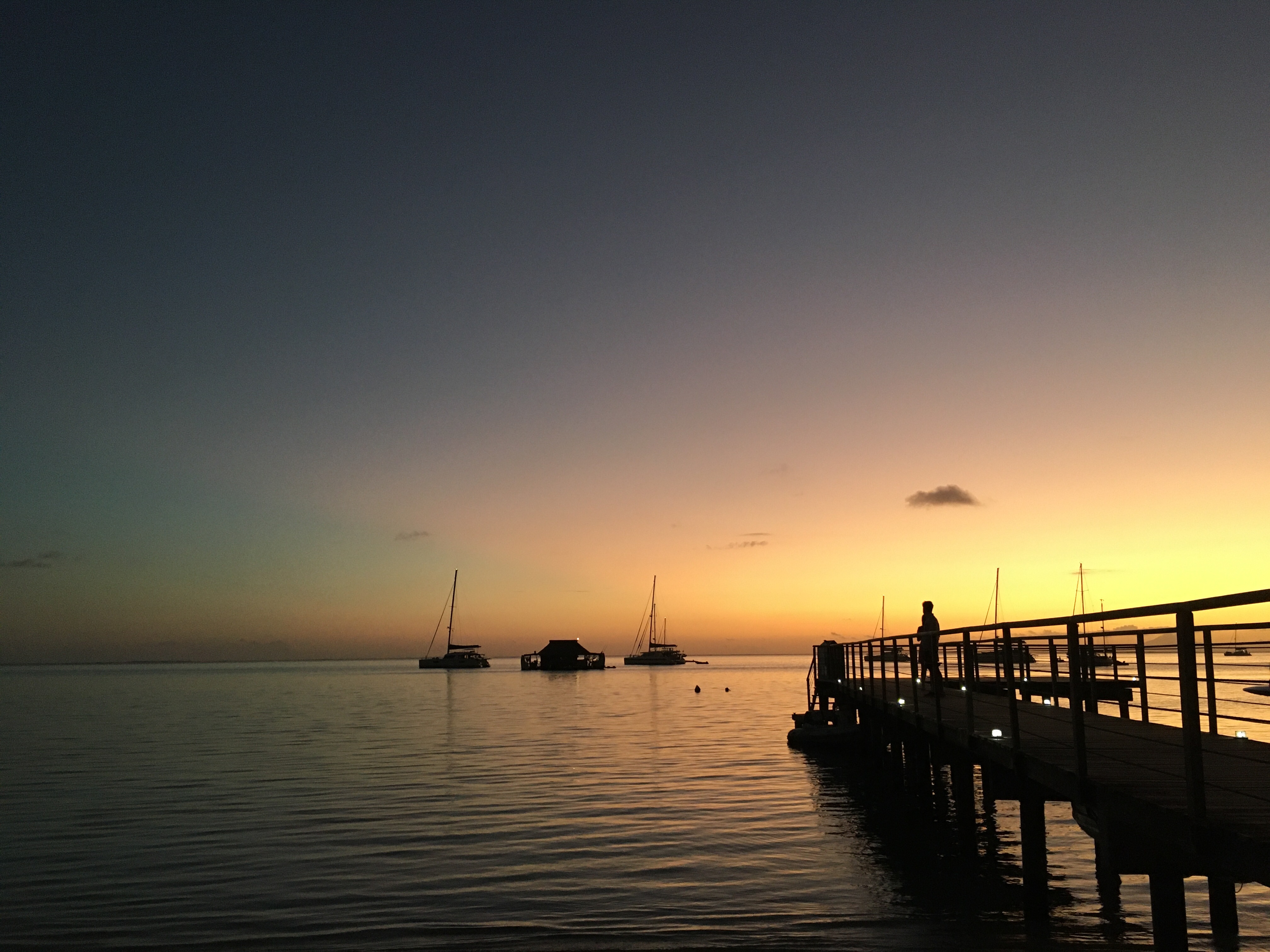 In Fare, dem Hauptort, lieg der Yachtclub. Malerisch, direkt beim Ankerplatz, mit Blick auf die Bucht. Wer nicht in einem schwimmenden Haus wohnt, kann sich wahrscheinlich nicht so recht vorstellen, wieviel Mehrwert für den Alltag so ein Plätzchen bietet. Fare hat einen für hiesige Verhältnisse bemerkenswerten Supermarkt, dazu Apotheke, Zahnarzt, Autovermietung etc. Ist ein Familieneinkauf fällig, düst man in ein paar Minuten zu einem guten, sicheren Dinghidock (viele Docks sind nicht für Dinghis und man muss mit Klimmzug obenauf klettern, oder die Klampen sind lose oder verrottet wie das Holz oder das Schlauchboot schürft an Beton… da könnte ich jetzt einen eigenen Blog drüber schreiben). Mal eben hinfahren, festmachen, aussteigen und loslaufen ist also sehr erfreulich. Wenn man die Einkäufe danach, binnen 10 Minuten, wieder sicher im Boot verstaut hat, ist das noch erfreulicher. Und falls nichts dringend in den Kühlschrank muss, kann man auch einfach bei dem netten Nachbarn am Tisch im Yachtclub hocken bleiben und noch zur Happy Hour ein Hinano (tahitianisches Bier) trinken. Darüber hinaus ist die Speisekarte ausgesprochen ansprechend und wer uns kennt, weiß wie sehr wir das, vor allem Abends, genießen.