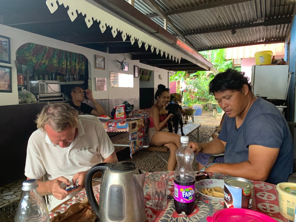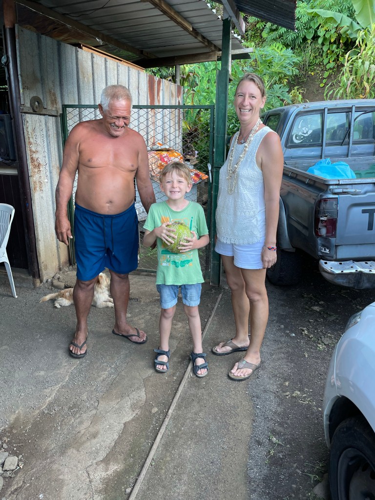 Der Abschied war herzlich – nächsten Sonntag sollen wir zu einem typischen Tahitianischen Essen wiederkommen. Wir freuen uns schon! Michel hat noch eine große Uru (Brotfrucht) geschenkt bekommen und ist dann, natürlich, auf dem Rückweg im Auto eingeschlafen.