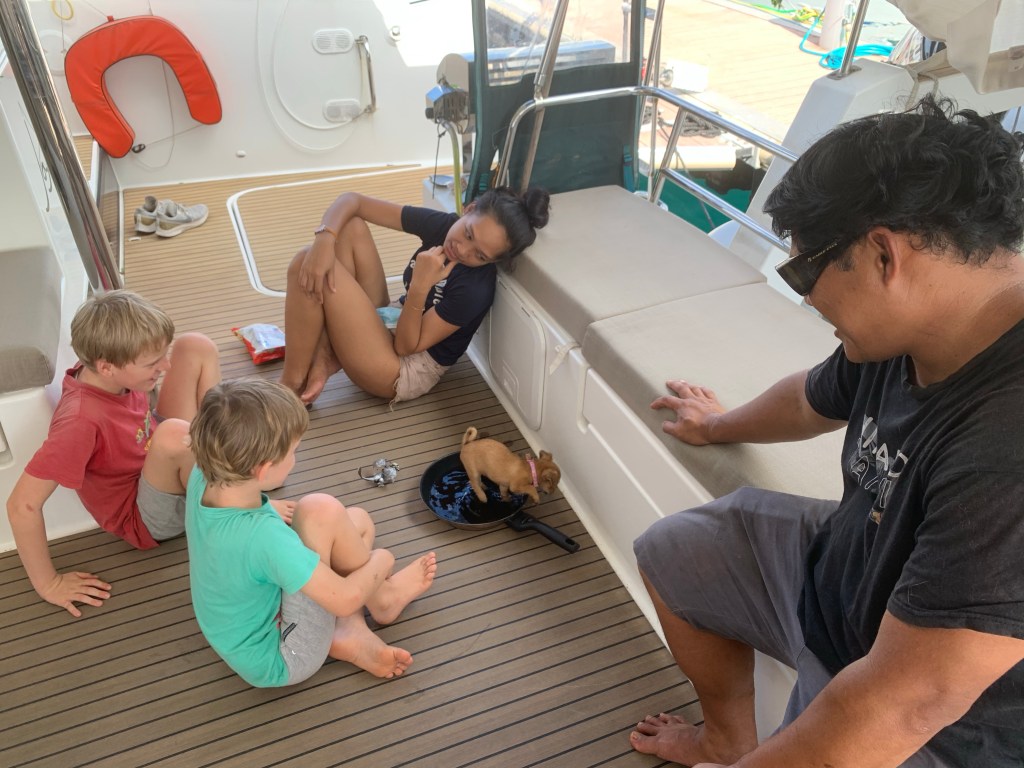 Dominik, dem unser Lieblings-Sushi gehört, und der uns mittlerweile ein guter Freund geworden ist, hatte uns in letzter Zeit ein paar Mal mit Hund und Hannah besucht. Hannah ist eine ganz süße Tahitianerin, arbeitet im Sushi Restaurant, und scheint so was wie eine Kusine von Dominik zu sein. Auf jeden Fall ist es schwierig zu klären, welche der 12 Hunde nun eigentlich ihr, oder doch Domi gehören. Drei von den Welpen haben nun schon, zum allergrößten Entzücken der Jungs, die Pami besucht. Und während die Lütten, beim letzten Mal, übers Boot getobt sind, hatten wir Großen uns für den nächsten Sonntag zum Picknick am Fluss verabredet.