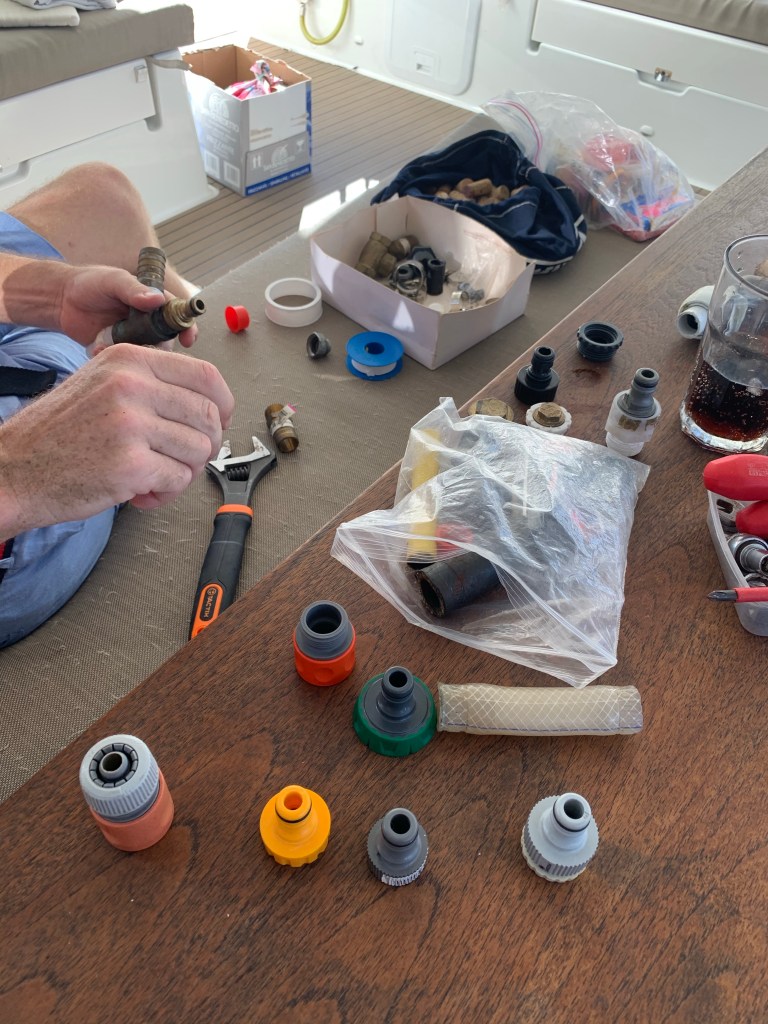 Ansonsten war dieser Sonntag bisher ganz normal. Brotbacken, Wäsche waschen, zum Markt für Obst und Gemüse und zwei Stunden im Motorraum die Wasserpumpe reparieren, damit es auf der Pami (im wahrsten Sinne des Wortes) wieder läuft. Ausnahmsweise mal nicht in der Mittagshitze, wie schön. Blöderweise sind in dem Wasser, das jetzt aus dem Hahn kommt, lauter winzige, hellbraune Schwebteilchen. Was ist das denn jetzt schon wieder? Algen oder Rost, die sich durch die Aktion irgendwo gelöst haben? Man man man. Am besten schicken wir die Jungs gleich mal ausgiebig zum Duschen. Davon wird dann hoffentlich beides sauber, die Kinder und die Leitungen und wir haben das teure Wasser nicht ins Hafenbecken laufen lassen…