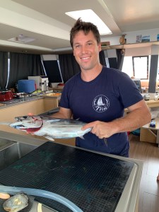 Spannend wird es, als wir durch einen Schwarm Seevögel kommen: alle starren gebannt auf die neuen Schleppangeln, die Alex organisiert hat. Und tatsächlich beißt ein Tunfisch an! Abendessen für acht ist gesichert!