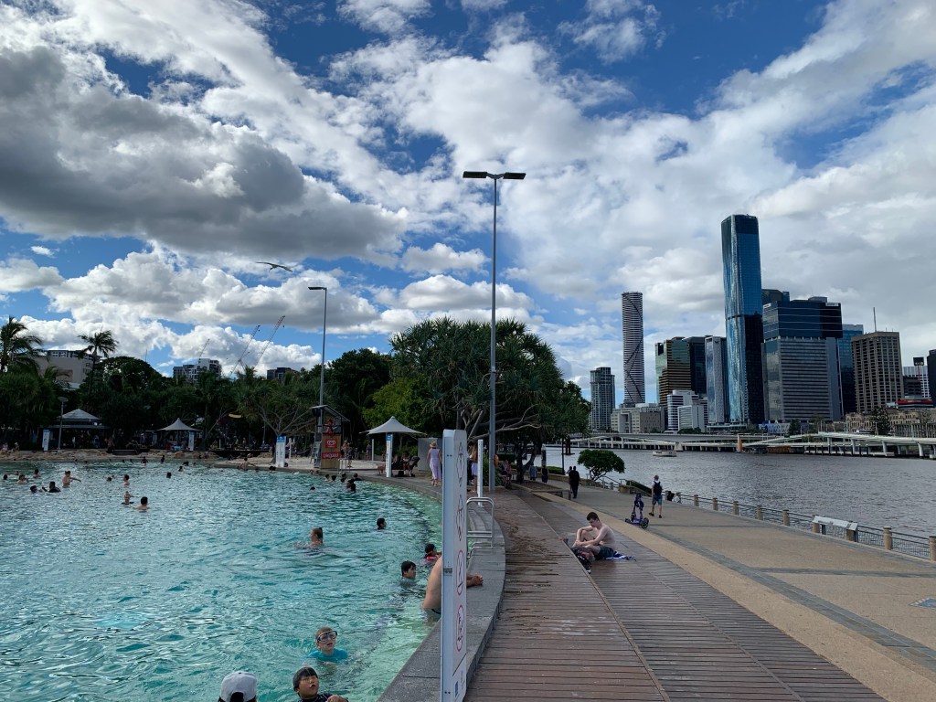 Der Fluss ist leider trüb braun, aber schwimmen kann man hier sowieso nicht. Bullenhaie kommen wohl auch so weit landeinwärts noch vor! Dafür gibt es gleich neben dem Fluss die South Banks Parkanlage mit großer Wasserlandschaft, die von richtigem Schwimmbad bis knöcheltiefen Kleinkindvergnügen alles bietet. Kostenlos, für jeden zugänglich, mit viel Gastronomie drumrum — ein echter Familientraum!