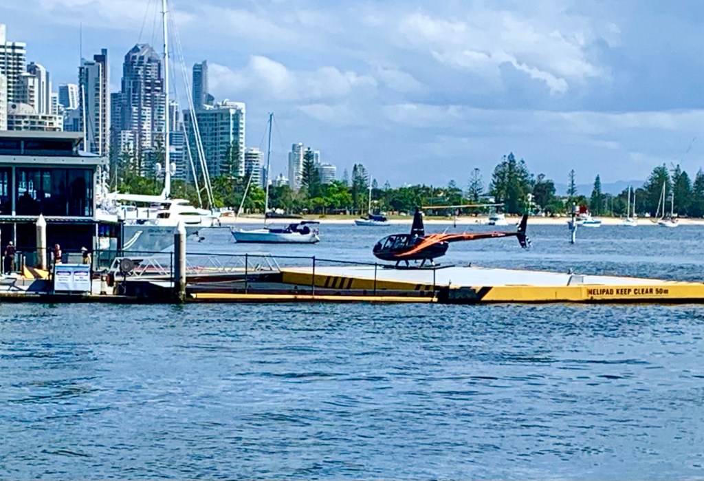 Hier, wo die vier Marinas nebeneinander liegen, ist das Broad Water wirklich broad und es ist der große Wasserspielplatz für alles, was Sprit verbrennt. Genau vor unserem Cockpit, schwimmt das Helipad, von dem, in Stoßzeiten im 5 Minuten Takt, die vier Hubschrauber starten und landen. 10-Minuten Rundflug für 100 $ – und leider ausgesprochen gerne gebucht! Was für ein Krach, und Resourcenverschwendung!