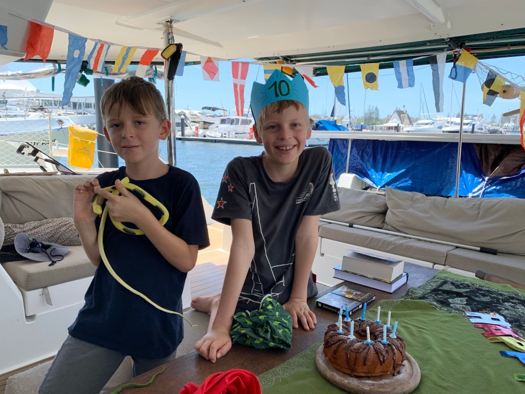Obwohl wir uns dieser Art Vergnügungen nicht ergeben, kommt keine Langeweile auf. Wie immer in neuen Landen, muss man etwas seine Garderobe anpassen. Und auch hier ist das nicht so einfach. Um an der Gold Coast normale Sandalen für Michel und einen Pulli für Paul zu kaufen, mussten wir erst mal rausfinden, dass es ein Shoppingcenter mit entsprechenden Sachen und Bootsanleger überhaupt gibt. Natürlich sind um uns rum jede Menge Läden, teuerste Boutiquen und auch Supermärkte, aber keine einfachen Kinderklamotten. Für wen auch? Letztlich waren wir nach 40 Minuten Dinghiritt, in einer wirklich super tollen Mall mit allem was man braucht. In den Shops von Pacific Fair fanden sich nicht nur die dringend benötigten Sandalen, sondern auch so nette Kleinigkeiten, die es in Papeete nicht, oder nur sehr teuer gab, wie z.B. Badezimmermülleimerchen.
