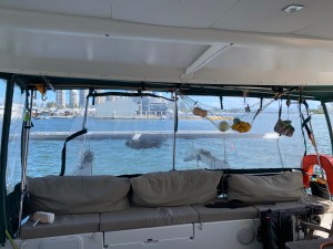 Die nächste Baustelle war dann wieder für mich: Die Kuchenbude der Pami, also die PVC-Fenster, die man rings ums Cockpit anbringen kann, passte nicht mehr ganz, seit wir in Panama die zweite Lage Solarpaneele angebracht haben. Seit den Kanaren haben wir die großen, heckwärtigen Teile nicht mehr gebraucht und im Keller verstaut. Hier sind sie plötzlich wieder ganz wichtig geworden und so habe ich mich ein paar Tage lang an meine kleine Nähmaschine gesetzt und Lösungen genäht. Wen es interessiert: die Bernina 215, mit dünnem Segelgarn und Ledernadel, schafft zwei Lagen Sunbrella mit einer Lage PVC, ziemlich problemlos! Daumen hoch!