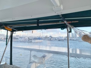 Zum Glück konnten wir uns mittlerweile an einen anderen Liegeplatz verholen. Hier ist es vergleichsweise ruhig und friedlich und der ständige Regen prasselt auch nicht mehr so direkt ins Cockpit!