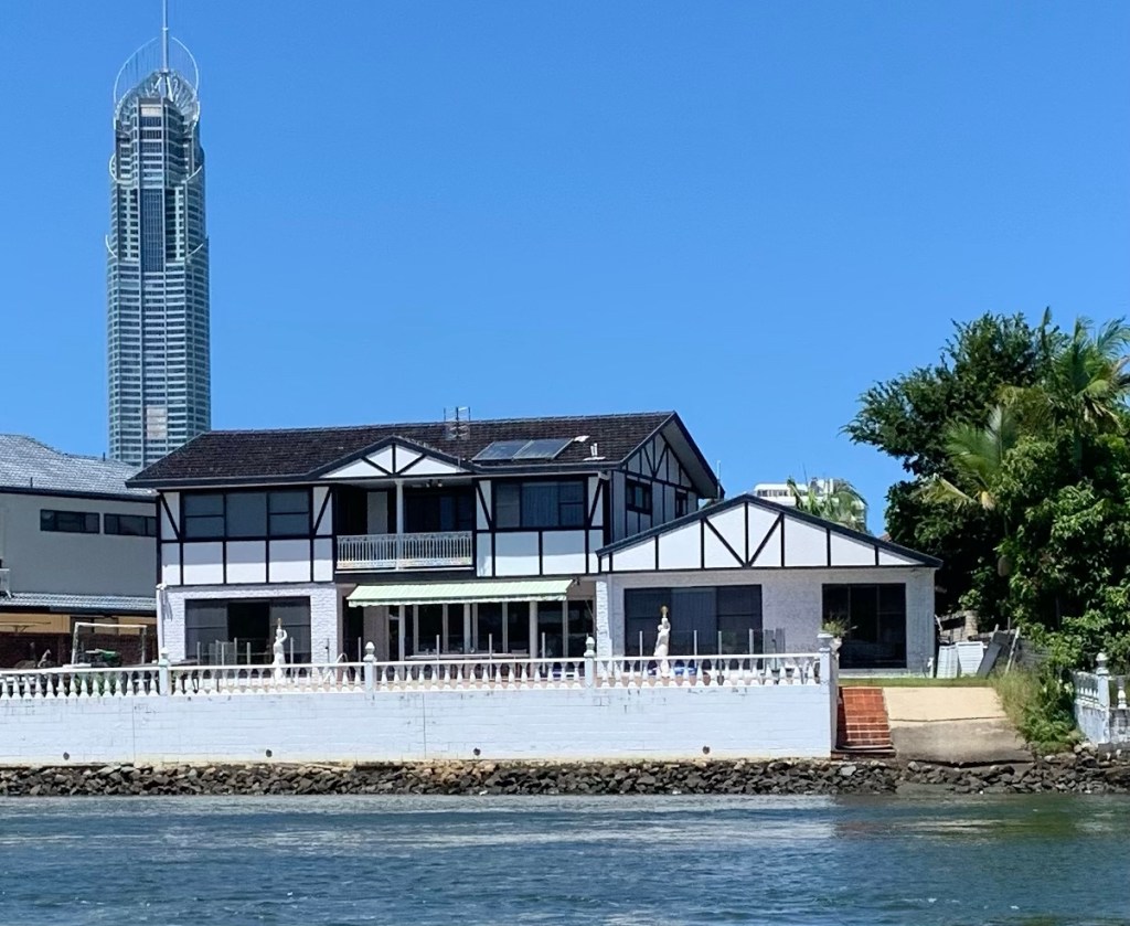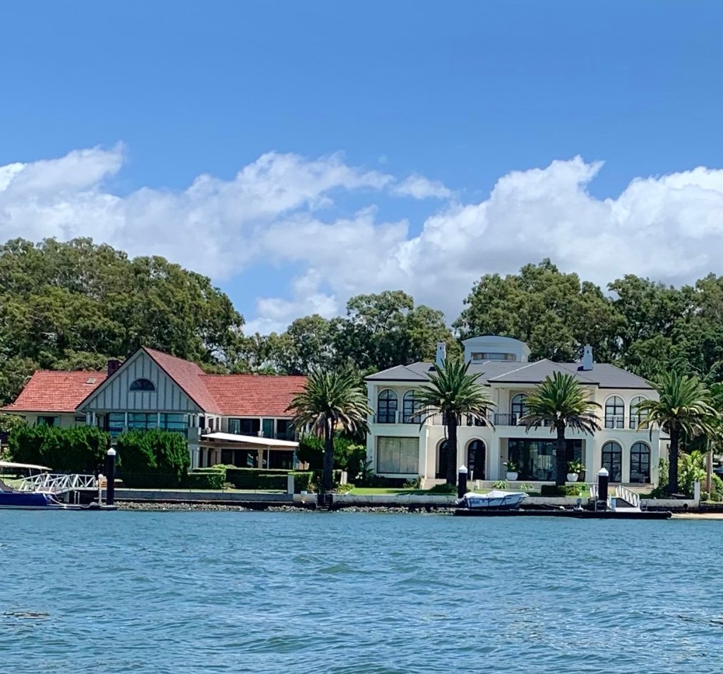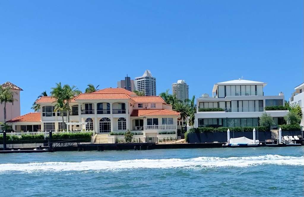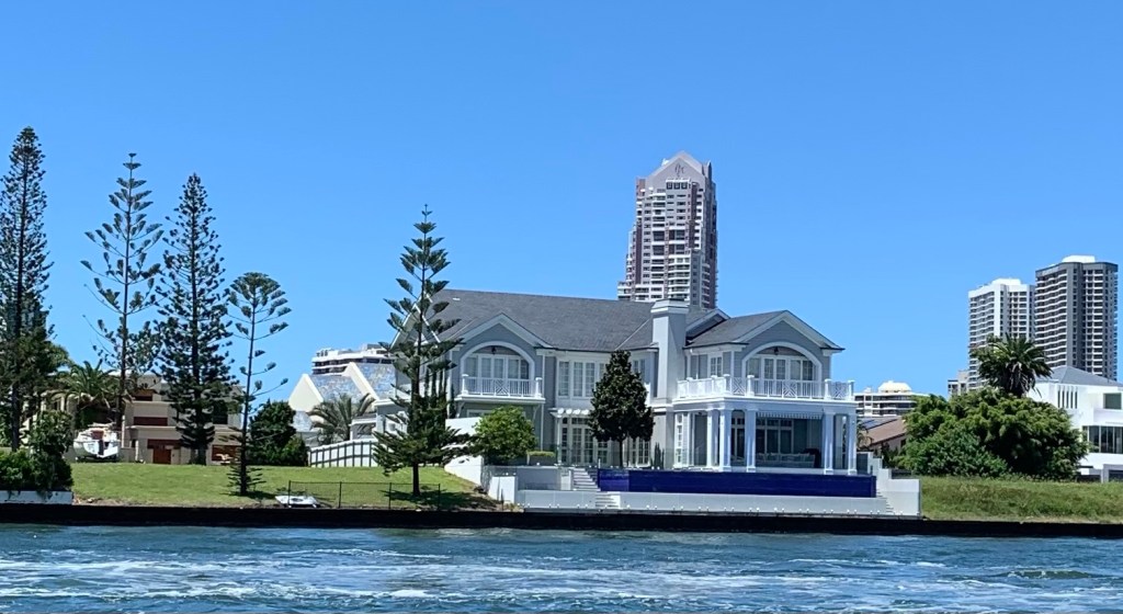 Am Ende noch ein paar unkommentierte architektonische Eindrücke von den Broad Water waterways, wie wir sie immer bei den Einkaufstouren vom Dinghi aus sehen. Ist schon einen Blick wert, wie mancher hier sein Anwesen gestaltet und vor allem die Vielfalt der Stielrichtung!