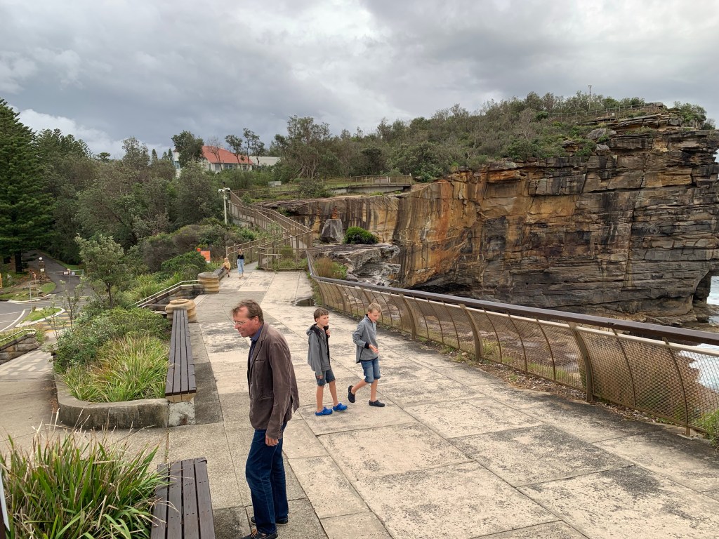 Vorletztes Wochenende haben wir daher mal wieder die Kurve gekratzt und uns in die Nachbarbucht verholt. Watsons Bay ist vermutlich auch ganz hübsch, durch den ständigen Regen, konnten wir dies nur nicht so recht würdigen. Da es aber die äußerste Bucht des südlichen Sydney Harbour ist, kann man mit einem kurzen Spaziergang die Klippen zum offenen Pazifik erreichen, was wir natürlich in der einzigen Regenpause auch getan haben. Belohnt wurden wir mit imposanten Gesteinsformationen und leider ein bisschen viel Bauzaun, der den Ausblick aus unbekannten Gründen verschandelt hat.