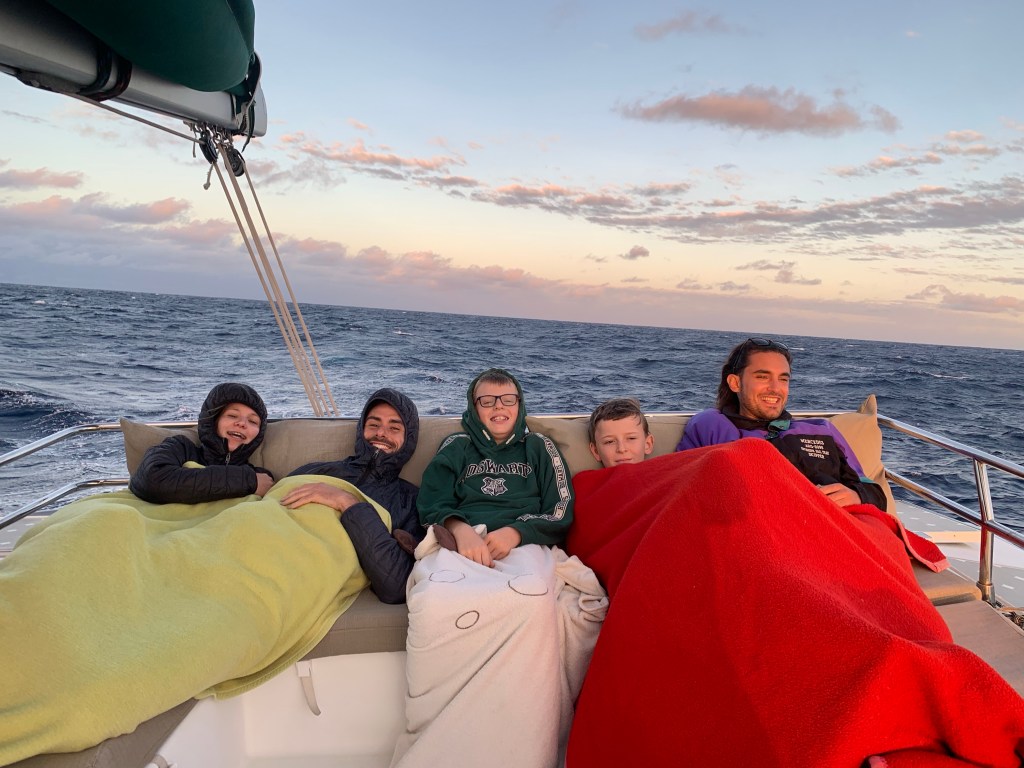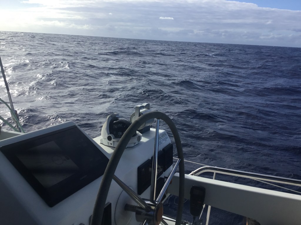 Die Nacht war angenehm ruhig und wir haben das zweite Etmal von 158 Nautischen Meilen in 24 Stunden zurückgelegt. Nicht sehr viel, aber ganz akzeptabel für einen Kurs auf Raumschots, also der Wind kommt von schräg achtern. Wir haben weiter um die 20 Knoten Wind aus südöstlichen Richtungen. Die Welle ist heute Nachmittag ruhiger geworden, wäre schön, wenn es so bliebe.