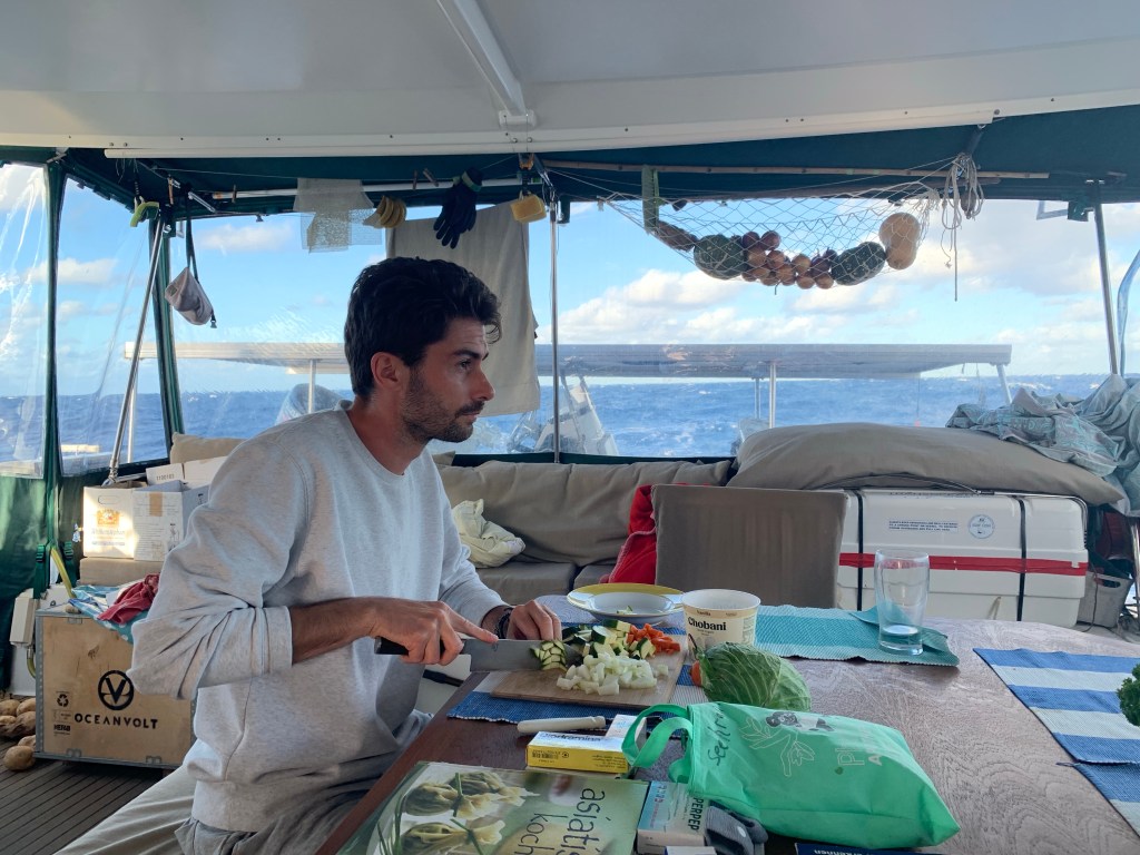 Nach dem Mittagessen mache ich mich daran meine Medikamentenbestände nach Seekrankheitstabletten zu durchforsten. Es besteht Bedarf. Bei Bianca und Marius wollen die Seebeine immer noch nicht so recht wachsen. Die Nachtwachen sind zum Glück kein Problem, aber mit gesenktem Kopf Gemüse schnippeln ist nur mit Pausen und Pillen möglich… Aber immerhin ist es möglich!