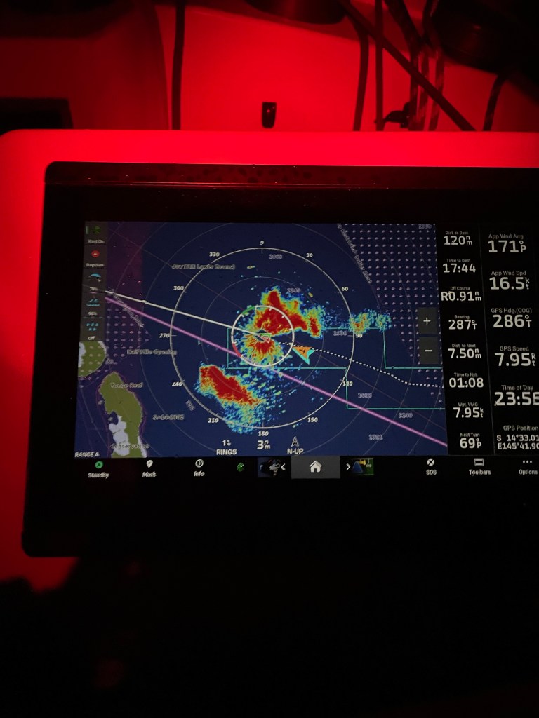 Nachmittags gab es noch ein bisschen Regen, aber wen stöhnt das schon? Wir nähern uns Thursday Island in gutem Tempo und Nachts zwischen Inseln und Leuchtfeuer hindurchzunavigieren macht eindeutig mehr Spass, als auf hoher See Wind und Wellen abzuwettern.