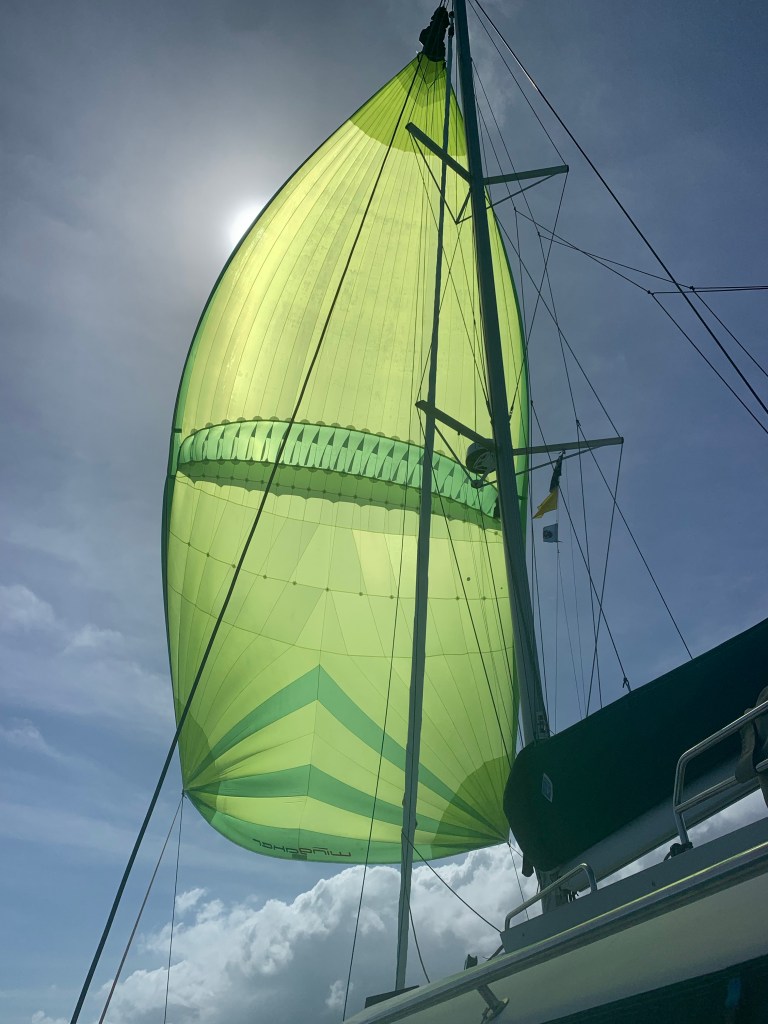 Unser großes, grünes Leichtwindsegel zieht uns mit 8 Knoten, bei nur 18 kts achterlichem Wind übers Wasser!