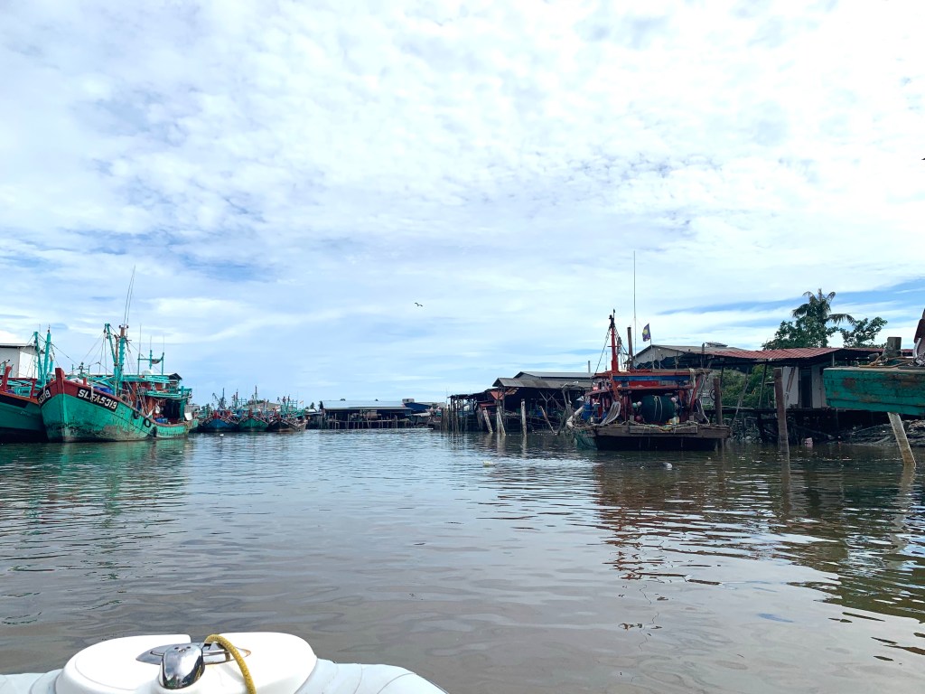 Sekinchan ist vielleicht der denkwürdigste Stopp auf diesem Tripp. Wir wollen zur Sicherheit noch ein bisschen mehr Diesel an Bord haben und sehen überall an Land Tankstellen. Also ankern wir die Pami kurzerhand vor dem Fischereihafen und fahren mit dem Dinghi auf Erkundungstour. Der Hafen ist… bemerkenswert. Fischerboote und Fischer und Fischabfälle, auch schon mal ne tote Ratte kieloben. Unsere kleine, deutsche Familie im Schlauchboot wird höchst erstaunt beguckt!