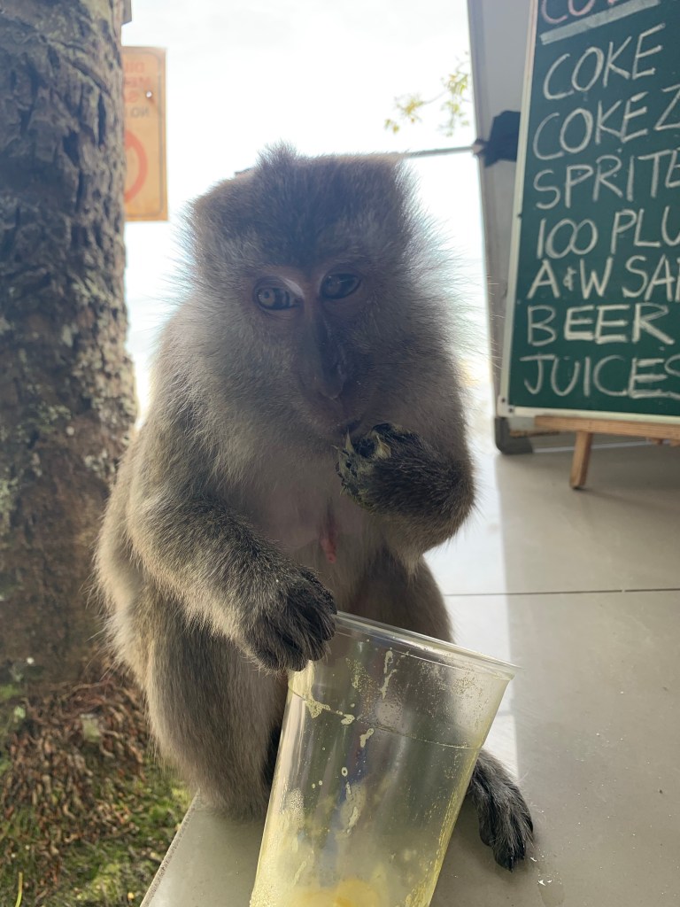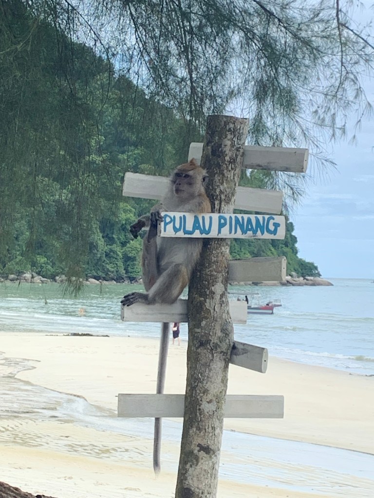 Pinang Monkey Island: Eigentlich wollten wir unsere Crew bis Langkawi mitnehmen, aber wie rausstellt, gibt es Einreiseformalitäten, die dies untersagen. Monkey Island hat Strandbars, einen Campingplatz und Möglichkeiten zum weiterreisen für sie. So stoppen wir auch hier und haben einen lustigen Mittag mit den Affen dort. Zusammen mit dem Essen bekommt man Besenstiele ausgehändigt um die Racker vom Tisch fern zu halten – auch ne Lösung!